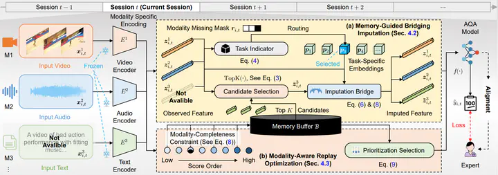 Action Quality Assessment (AQA) aims to score how well an action is performed and is widely used in sports analysis, rehabilitation assessment, and human skill evaluation. Multi-modal AQA has recently achieved strong progress by leveraging complementary visual and kinematic cues, yet real-world deployments often suffer from non-stationary modality imbalance, where certain modalities become missing or intermittently available due to sensor failures or annotation gaps. Existing continual AQA methods overlook this issue and assume that all modalities remain complete and stable throughout training, which restricts their practicality. To address this challenge, we introduce Bridged Modality Adaptation (BriMA), an innovative approach to multi-modal continual AQA under modality-missing conditions. BriMA consists of a memory-guided bridging imputation module that reconstructs missing modalities using both task-agnostic and task-specific representations, and a modality-aware replay mechanism that prioritizes informative samples based on modality distortion and distribution drift. Experiments on three representative multi-modal AQA datasets (RG, Fis-V, and FS1000) show that BriMA consistently improves performance under different modality-missing conditions, achieving 6--8% higher correlation and 12--15% lower error on average. These results demonstrate a step toward robust multi-modal AQA systems under real-world deployment constraints.